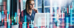 Young woman working at modern office.Technical price graph and indicator, red and green candlestick chart and stock trading computer screen background. Double exposure. Trader analyzing data News in Review 7th January 2026
