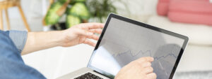 Close-up of male hand touching stock market analysis digital display screen. Businessman analyzing investment and financial trading. Business and finance. Home office. Economic Review January 2026 3rd February 2026