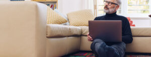 Businessman working on the floor on his laptop computer sitting on a brightly colored carpet in his socks looking thoughtfully to the side News in Review 1st April 2026